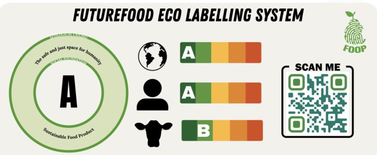 The eco-labelling tool developed under the FOODPrint project is based on the Doughnut Economics framework, which balances both planetary boundaries (such as climate change and environmental impact) and social foundations (such as safe working conditions and human rights), promoting a holistic sustainability assessment of food products. The tool uses a grading system from A to E, based on an evaluation conducted through a 30-question assessment covering planetary health, human wellbeing, and animal welfare.